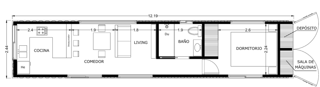 • Construcción: Contenedor marítimo reciclado, resistente y eficiente